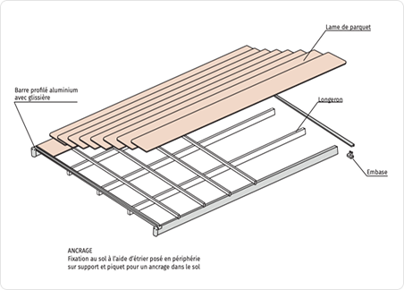 Composés de poutres en acier et de joints en aluminium, nos planchers offrent une base solide et parfaitement fixée au sol. Le bâti ajustable permet un calage précis. Nous vous proposons une finition lasure chêne pour un rendu à la fois sobre et raffiné.